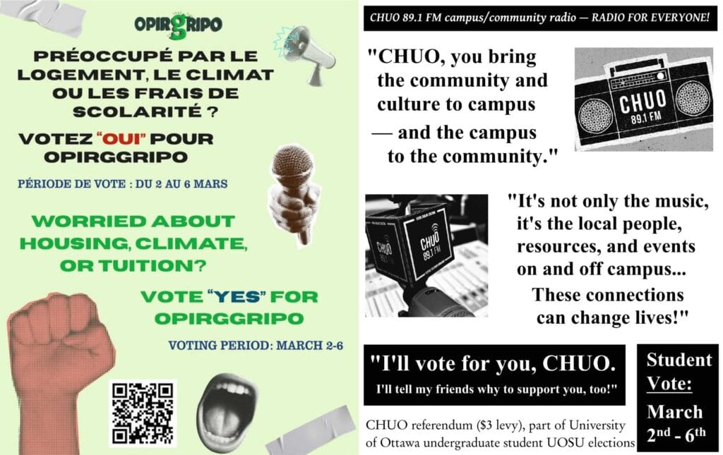 Two of the questions on their ballot this week, as part of the annual general elections for undergraduate students, are on re-establishing student levies for campus/community radio station CHUO 89.1 FM and for OPIRG-GRIPO, the Ontario Public Interest Research Group at uOttawa.